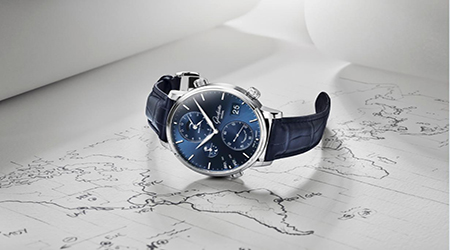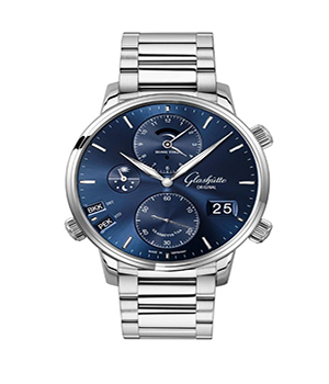 这一新款午夜蓝色表盘的Senator Cosmopolite 议员世界时腕表同样是以中央的时针和分针指示当地时间;而家乡时间显示于12点钟位置的子表盘上,实用的昼夜显示和动力储存显示也设在这里。此外还有6点钟位置的小秒盘、9点钟位置的当地昼夜显示以及4点钟位置的Glashütte Original 格拉苏蒂原创标志性大日历显示令Senator Cosmopolite 议员世界时腕表的考究设计更臻完善。