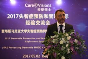 塔斯马尼亚大学WICKING失智症研究院院长James Vickers也对参会人员就“失智症预防网络在线课程以及对中国失智症状况的影响”问题进行了分享。塔斯马尼亚大学一直走在教育前沿,而该校的网络公开课(MOOC)拥有世界闻名的课程,在预防失智症方面,MOOC设置了专业课程,能够帮助课程参与者对失智症领域更加了解。