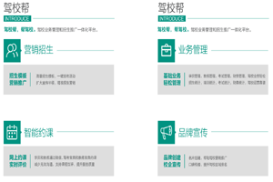 “驾校帮”,顾名思义就是帮助驾校,“驾校帮”综合服务管理平台立足于驾校的各项日常管理需求,涵盖营销招生、智能约课、业务管理、品牌宣传、考试管理、财务管理等核心模块,并利用移动互联网的优势,实现学员和教练之间的网上约课、双方互评,轻松管理学员从报名到拿证毕业的全部流程。