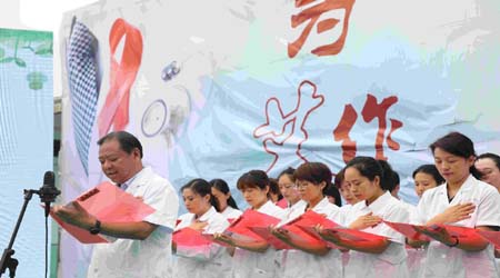 在“艾之证词”环节中,百名医生庄严宣读了“为艾作证”誓词,志愿成为艾滋病反歧视的一员,为感染者创造平等、友爱的就医环境,并投身于艾滋病反歧视宣传工作,将正确的防艾知识科普于社会。
