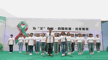 在接下来的“艾之携手”环节,来自山西师范大学的百名同学共同宣读誓词,支持“共享教育”的倡议。誓词中强调:愿意从自身做起,接纳并关爱艾滋病HIV感染者同学,共享一个学习与生活的空间。手拉手,让全世界知道,象牙塔里没有歧视。