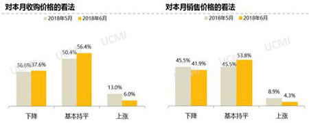 调查显示,6月份库存量相比5月减少,库存周转时间相比5月增加。其中认为库存量“增加”的经销商比例为29.1%,“减少”的比例为31.6%;认为库存周转时间“增加”的经销商比例为43.6%,“减少”的比例为11.1%。6月份收购量减少,导致库存量减少,库存压力减小。