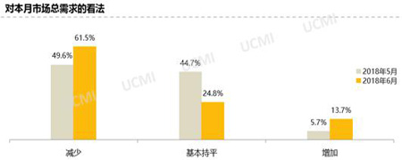 调查显示, 6月份二手车市场总需求相比5月份减少,认为市场总需求“减少”的经销商比例为61.5%;“增加”的比例为13.7%。6月份天气炎热,到店客流量少,加上,最近房价上涨,影响了消费者购车意愿,尤其是那些二、三线城市的买房刚需客户,这一定程度上导致6月份市场总需求减少。