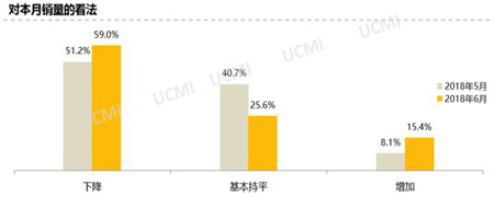 调查显示, 6月份二手车销量相比5月份下降,认为销量“下降”的经销商比例为59.0%;“增加”的比例为15.4%。6月份依然处于市场淡季,市场需求减少,导致二手车销量下降。