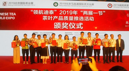 接着,消费者翘首以待的“领航迪泰”2019“两展一节”茶叶产品质量推选活动也进行了最终结果公布;评审专家代表孙丹威女士上台宣读了推选名单,相关领导为企业进行授牌。此后,王庆会长、马俊民部长、王奇副主席、丛日芳总经理为2019北京国际茶业展的展会指定产品生产企业进行授牌。