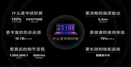 100%DCI-P3广色域及PANTONE色彩认证、10bit 10.7亿色彩、1000000:1对比度及550nits峰值亮度、0.2ms极速响应时间、支持DC调光及70%降低蓝光及持有自发光屏幕,六大华硕好屏功能重磅加持,为用户带来了美轮美奂的沉浸式视觉体验。